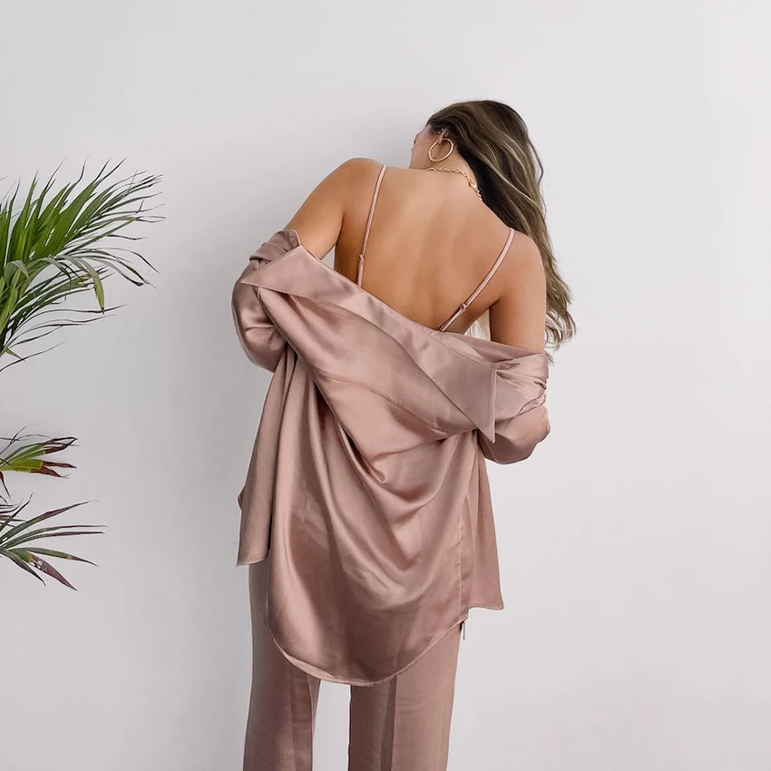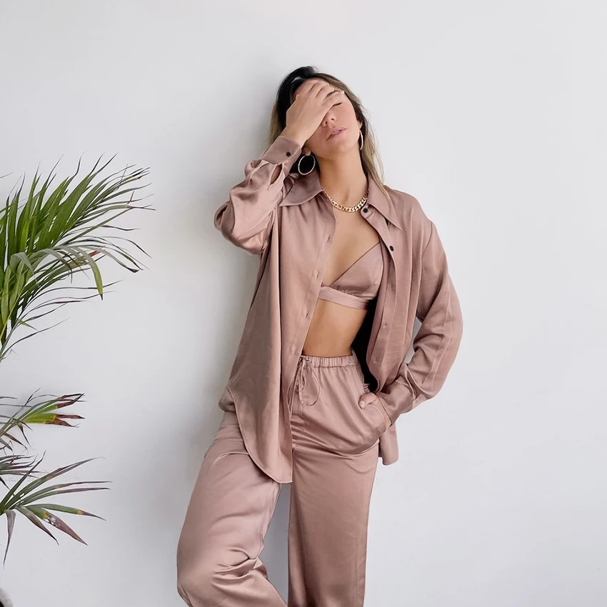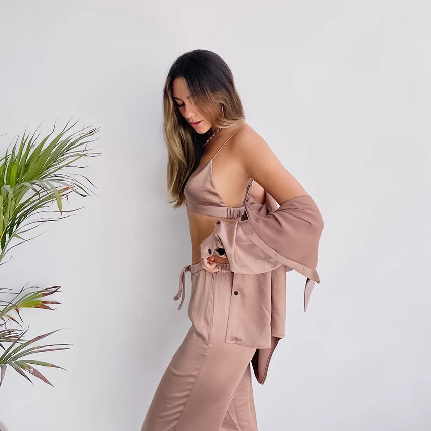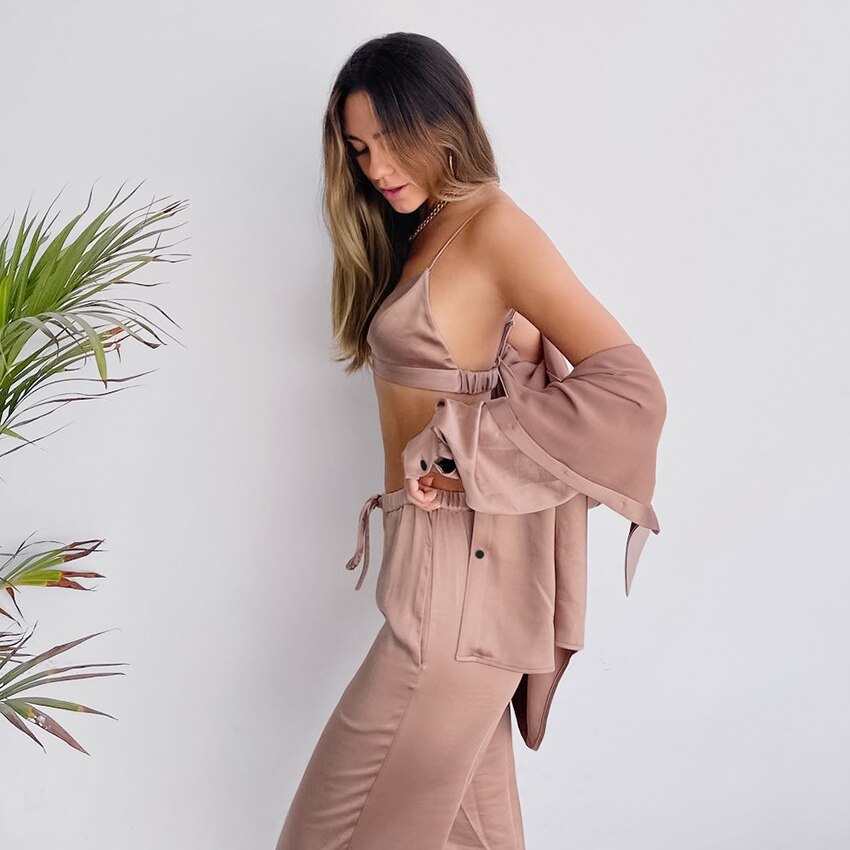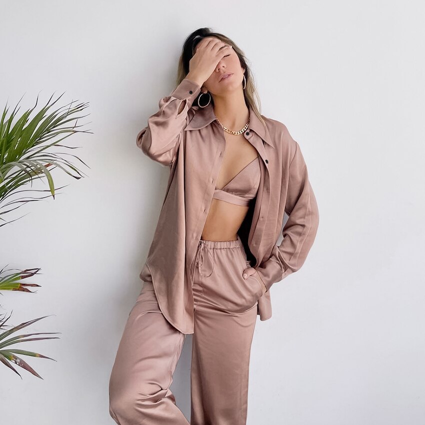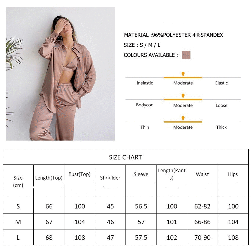The Champaign Satin Sleepwear Set is a luxurious and elegant sleepwear ensemble that includes three pieces: a nightgown with long sleeves, trousers, and a bra. The set is made from high-quality fabric, which is smooth, soft, and silky to the touch, providing maximum comfort and a luxurious feel.
