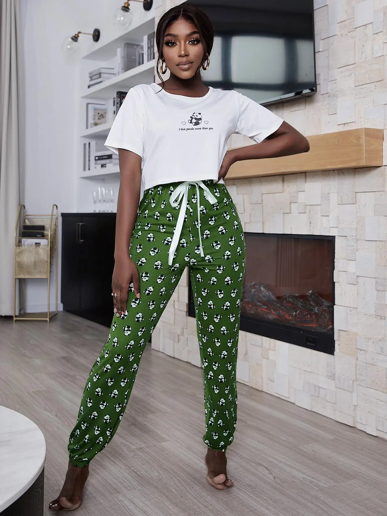 Adorable Panda Print: The green ankle-length pants showcase a cute panda motif, adding a touch of whimsy to your sleepwear collection.