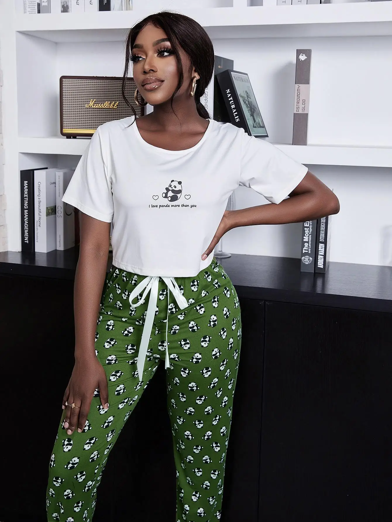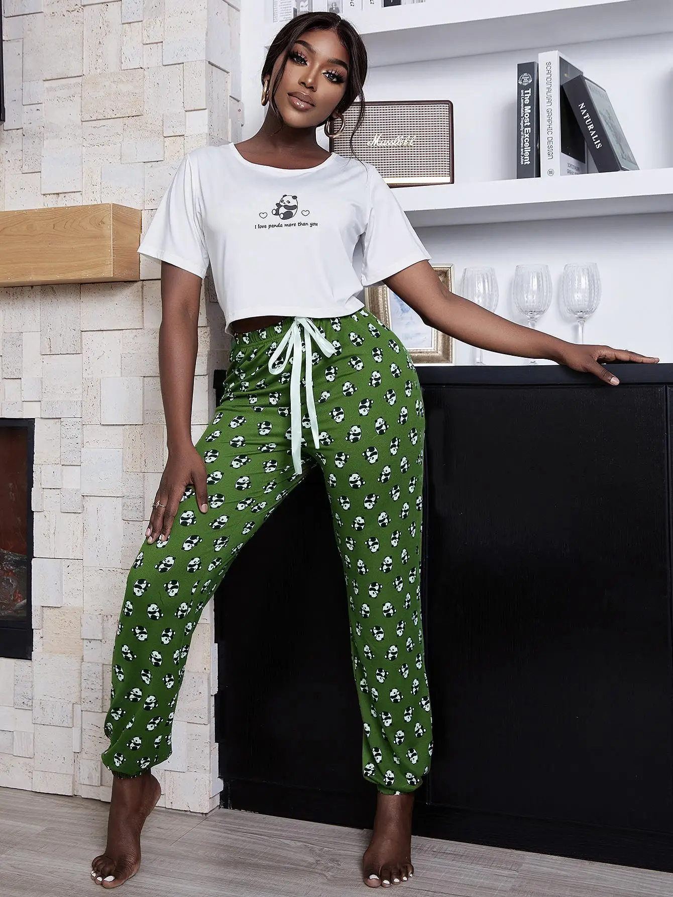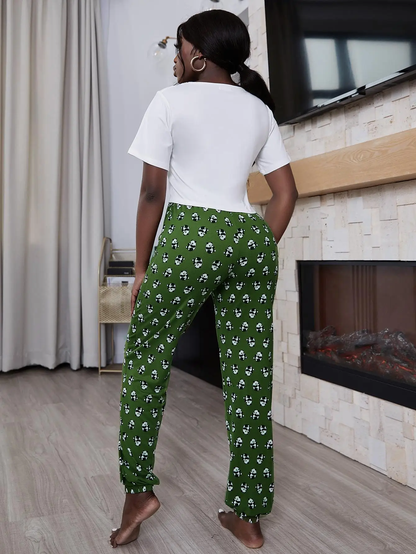 Adorable Panda Print: The green ankle-length pants showcase a cute panda motif, adding a touch of whimsy to your sleepwear collection.