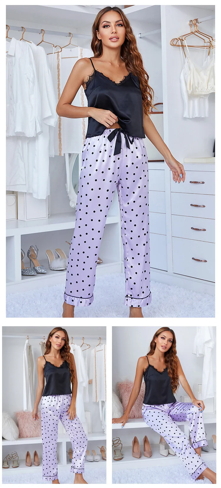 This Sleeveless Comfortable Nightwear Set is the perfect choice for those looking for a stylish and comfortable sleepwear option. This set includes a black spaghetti top with matching purple silk trousers and black dots, creating a chic and coordinated look.